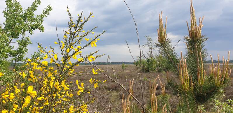 Na gebak in Wijster steken we de A28 over en komen in het Dwingelder Veld terecht: een gigantisch heidegebied. De wolkenloze blauwe lucht is inmiddels vervangen door een grijsblauwe lucht, met een lichte dreiging. Zo her en der wordt de heide uitgelicht door de zon. Extra mooi.