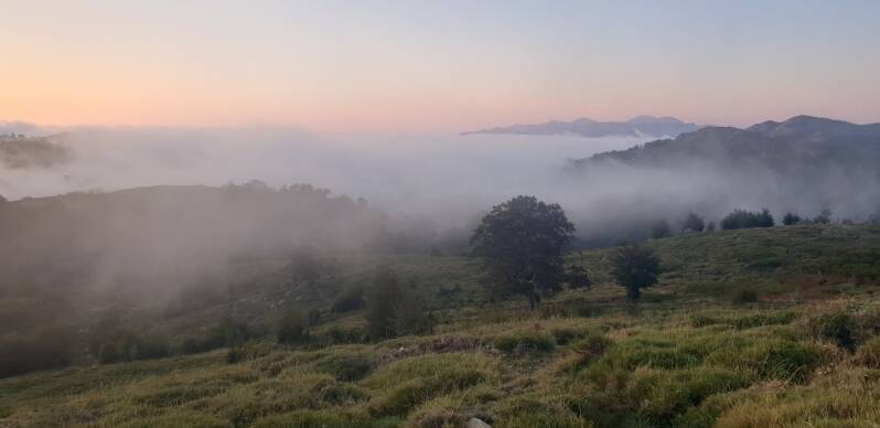 De zon komt op, het belooft een prachtige wandeldag te worden. We beginnen met een klauterklim van 500 meter vanuit de bergerie van Aline naar het zadel op zo'n 2.000 meter. Daarin zijn we niet de enige: met ons klauteren ook anderen omhoog en de eerste tegenliggers komen ons al tegemoet. Boven hebben we een schitterend uitzicht over afgeronde, stenige heuveltoppen die me doen denken aan de Cevennen.
