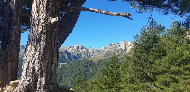 Na de Bocca begint de lange afdaling naar Vizzavona, dat 900 meter lager in het dal ligt. Het is een makkelijke wandeling, over een goed te belopen pad. We houden de Monte d'Oro in het vizier, totdat we het bos in duiken. Onderweg komen we twee krasse zeventigers tegen, die zich naar boven torsen. Dat gaat langzaam, maar gestaag. De twee mannen houden halt voor een vriendelijke groet. Ze lijken wel meer te willen, maar ik heb er lekker de sokken in en wil verder.