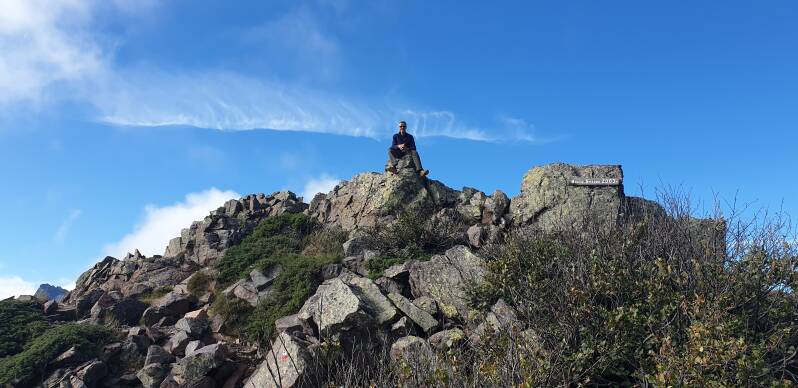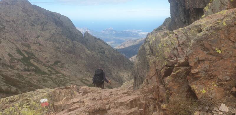 Na 1,5 uur klauteren staan we op de Bocca di Stagnu, op 2.003 meter hoogte. Het uitzicht is magnefiek. Hoe fijn dat we deze laatste dag eindelijk ver kunnen kijken! Het doet pijn om te weten dat onze tocht bijna ten einde is. Maar we mogen nog even doorgaan: 1,5 uur lang klauteren we op hoogte rond, tot we in de verte de zee zien liggen, met een stad: Calvi. Daar moeten we heen. We gaan de afdaling aan.